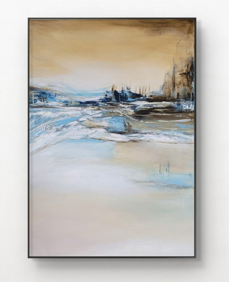 Beschreibung: Acryl auf Leinwand. Das abstrakte Gemälde zeigt eine Landschaft in gedeckten Farben, die eine ruhige und melancholische Stimmung hervorruft, mit subtilen Licht- und Schatteneffekten. Die Komposition ist in horizontale Zonen aufgeteilt, wobei der untere Teil durch eine helle, cremefarbene Fläche dominiert wird, die sich nach oben hin aufhellt. Im mittleren Bereich finden sich Wellenbewegungen …