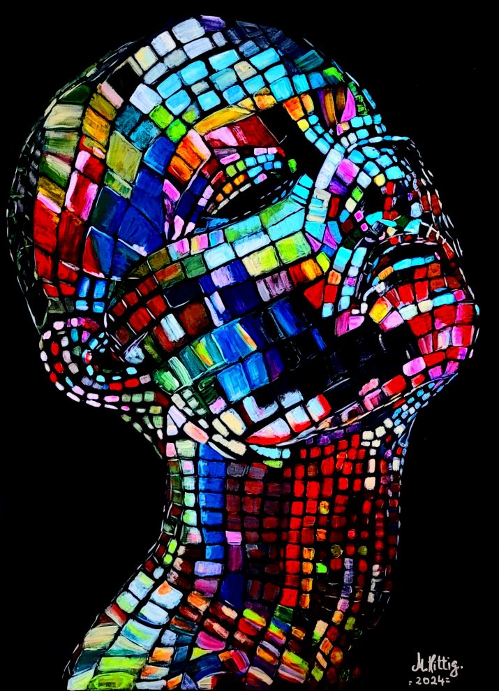 Ein Mosaik der Momente, jeder Splitter ein geflüsterter Traum, Verwebt in ein Gesicht, das den Betrachter bannt in seinem Raum. Von Glutrot der Leidenschaft zum Seeblau der Sehnsucht gewandt, Erzählt sie Ewigkeitsgeschichten, in jeder Schattierung gekannt.