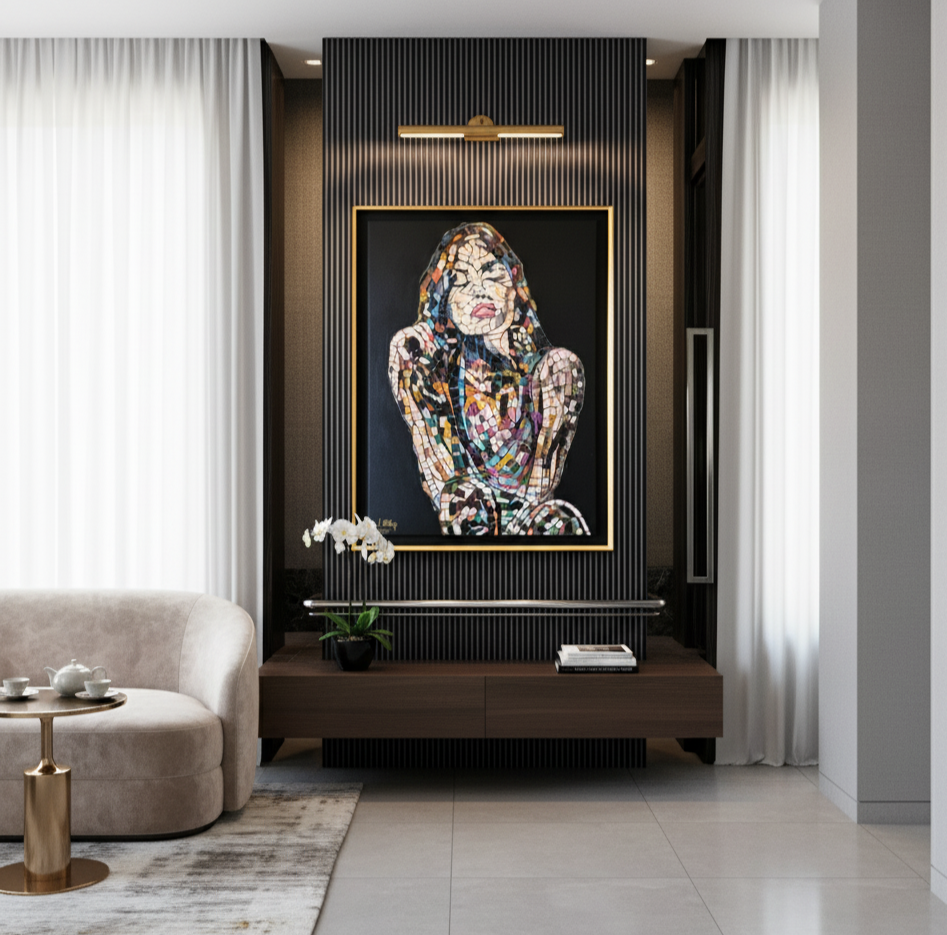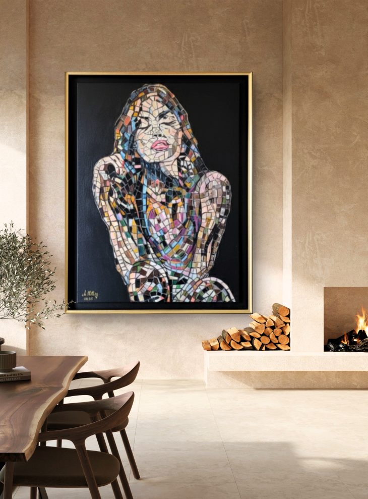 Dieses faszinierende Kunstwerk fängt die Essenz menschlicher Emotionen in einem Kaleidoskop aus Fragmenten ein. Jedes sorgfältig platzierte Stück Mosaikglas bildet eine Facette der Seele und offenbart die Vielschichtigkeit unserer inneren Welt. Der Betrachter wird von einem Blick empfangen, der sowohl zerbrechlich als auch tiefgründig ist – ein Blick, der die Stärke und Schönheit offenbart, die aus den zahllosen Erfahrungen des Lebens entstehen. Es ist eine Hommage an die Komplexität des menschlichen Geistes, ein stilles Echo der Emotionen, das in tausend Farben schimmert und verführt.